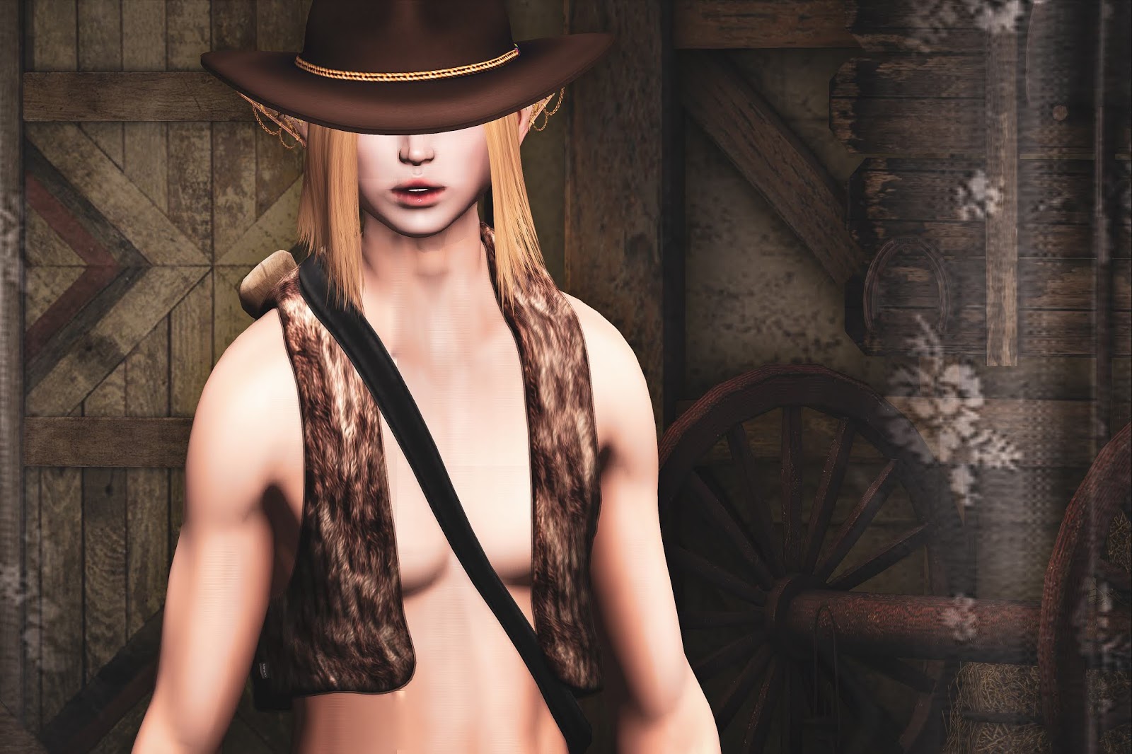 Howdy Partners! It is a horribly rainy and dark day here in Scotland, but luckily in Second Life we can make the weather anything we like. Today's post is brought to you by: I saw someone with this vest in pink which I loved and thought I could do something super cute with. So I got it, put it on, and I loved the brown furr colour that it came in. So I ran with that instead of going all pink. In fact, I have not even touched the HUD, because I just loved the look of this brown on my avatar and once I teamed it up with these leather pants the idea was set. I wanted to be a cowboy baby!